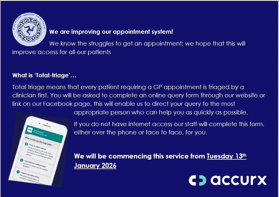 From Tuesday 13 January ALL GP APPOINTMENTS will need to be triaged by a clinician, who will advise when you need to be seen.