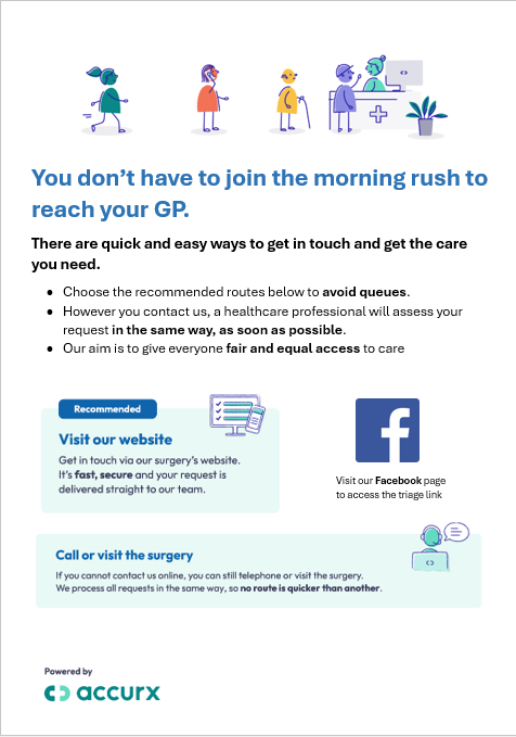 From Tuesday 13 January ALL GP APPOINTMENTS are being triaged by a clinician who will advise when you need to be seen.